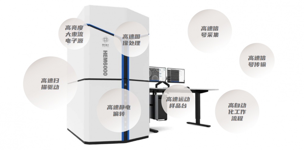 采用高亮度大束流电子枪、高速电子偏转系统、高压样品台减速、动态光轴、浸没式电磁复合物镜等技术,实现了超快的数据采集和成像速度,同时保证了纳米级分辨率。