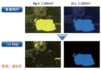 TruMap功能可实时分离出谱峰重叠元素,并以面分布形式显示。常规面分布时容易发生重叠的Mg-K和As-L也可以不受谱峰重叠影响,得到清晰的面分布图像。