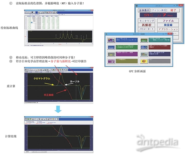 数均分子量 重均分子量 Z均分子量 粘均分子量 固有黏度 多分散度 | 校准曲线显示 校准曲线的报告输出 洗脱曲线 洗脱曲线的报告输出 微分-积分分子量分布曲线显示 微分-积分分子量分布曲线的报告输出 | 最小二乘法平差 2次~5次曲线 标准曲线上的数据点 最多50个 通用标准曲线的转化功能 各标准曲线的链接功能 手动输入标准曲线的创建 |