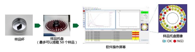 切下适量的样品放在样品杯内,将其置于样品托盘上。之后进行简单地软件操作,利用自动进样器开始进行自动测量。在软件操作屏幕上显示样品图像,可以随时确认连续测量的进展情况和判定结果(OK/NG)。