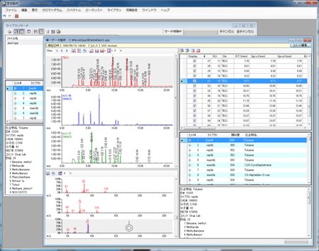 Escrime软件旨在为GC/MS数据的解析提供更简单、更高效的综合分析,并提供了新的用户界面。新开发的定性分析软件将定性分析所需要的信息整合到了一个窗口。谱峰列表(Peak List)管理所有的谱峰信息,能高效率地进行谱图分析、谱库检索及生成色谱图等。