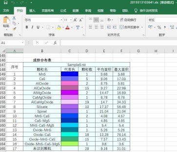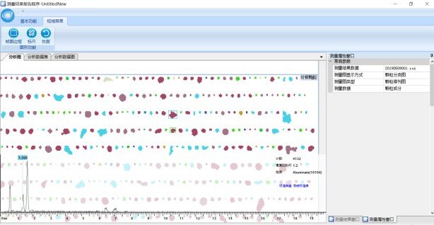 可以以全貌查看颗粒的分布情况。 可以放大查看单颗颗粒的具体形态。 不同颗粒类别按标准库设定颜色显示。 显示颗粒的X-Ray能谱数据。
