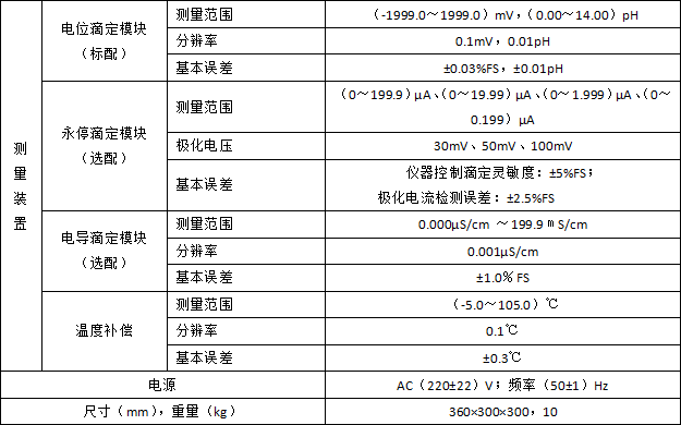 l 模块化设计,由容量滴定(库仑)装置、控制装置、测量装置(电位、电导、永停)组成,通过不同组合可实现电位滴定、电导滴定、永停滴定;