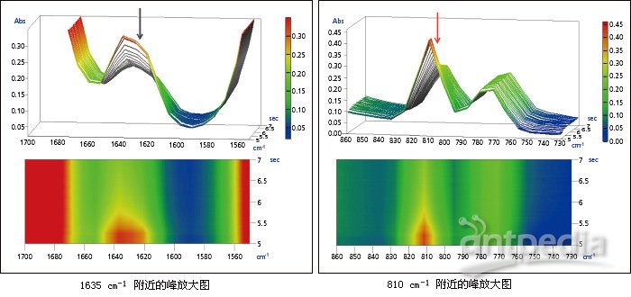 表示1635 cm-1 以及 810 cm-1 的峰面积时间扫描图。紫外线照射后的数秒内,这些峰急剧地减少了。