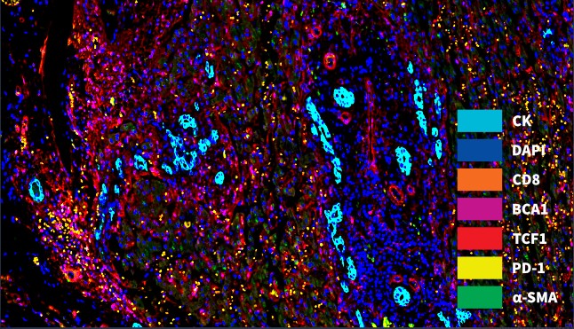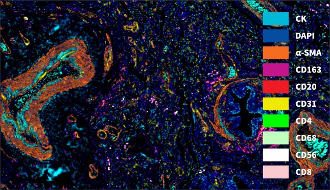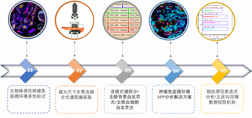 基于全新一代TSA染色技术同时标记10种生物标志物后,使用TissueFAXS Spectra系统进行连续全光谱高 倍率成像,构建全景(多光谱)虚拟切片。