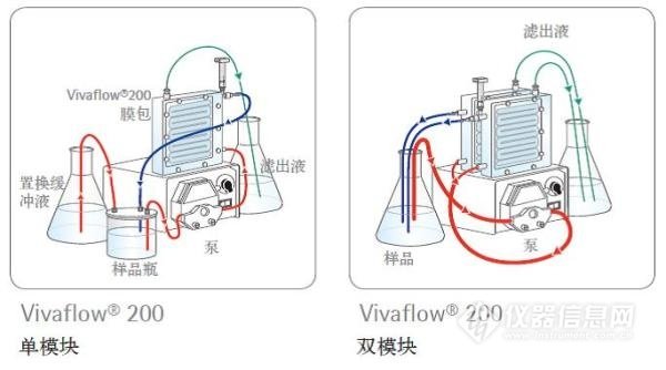 与Vivaflow® 50R相同,Vivaflow® 200是一款可重复使用的切向流膜包,可提供多种膜:改性再生纤维素Hydrosart®膜和PES膜。该膜包非常适合对病毒和抗体等昂贵的样品进行浓缩。同样,也可以将两块Vivaflow® 200膜包并联使用,提高流速,提高样品处理量至5L。