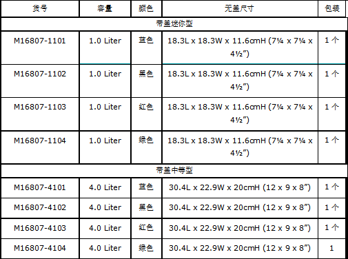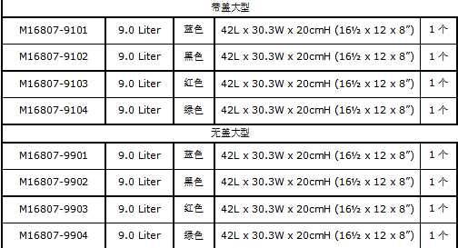 • 有迷你的1.0升、中等的4.0升和最大的9.0升尺寸,每种尺寸有四种颜色:蓝色、黑色、红色和绿色
