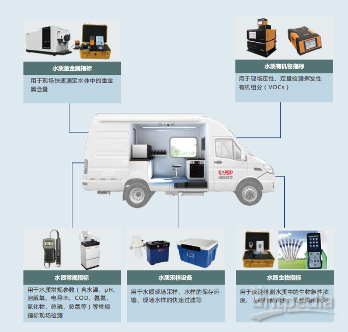 水质应急监测车以各种车载科学仪器为核心,以商务车、客车及厢式卡车方舱等载具,设计符合国家应急装备配置要求,可用于现场水质快速、准确监测,可满足各级环境监测部门、执法监测及其他日常监测需求。