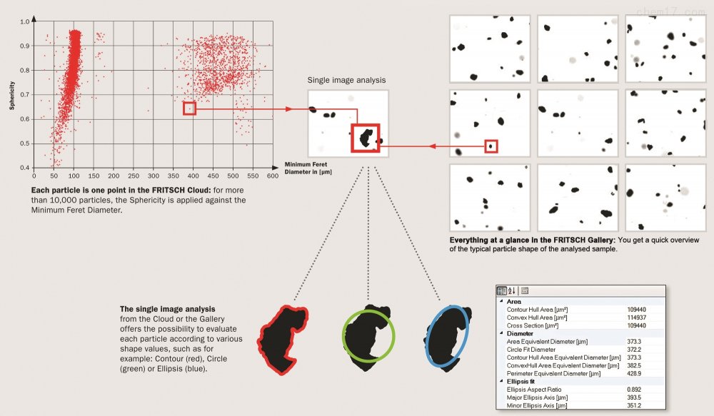 8. Analysette 28 ImageSizer拥有的FRITSCH云技术,可直观的对颗粒进行形态分析。