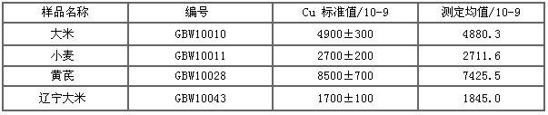 从表4~6的测试数据可以看出:采用本方法测定重金属镉、铅浓度低于国标限量浓度的食品国家标准样品,测试结果的准确度为80%-120%,方法检出限为镉:0.5μg/kg;铅:1.0μg/kg;铜:0.5μg/kg。