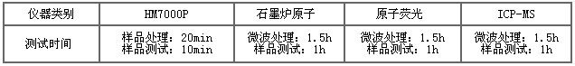 HM7000P在样品处理和测试过程中,除需要使用燃气、试剂外,无需其它耗材,且易损配件少,同时HM-7000P无需外接电源。而微波在使用过程中需外接高压电源,功率高、耗电量大,且高温消解罐、温度压力传感器、防爆垫皆为易损耗材,价格昂贵,即使用成本高。下表1为HM7000P与其它实验室设备的使用成本比对。