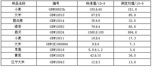 选取包含粮食、蔬菜等众多种类的食品国家标准样品,采用HM-7000P进行样品处理并测定,测试结果如表4~6所示: