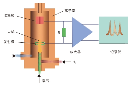 氢火焰离子化检测器(FID),它是典型的破坏性、质量型检测器、是以氢气和空气燃烧生成的火焰为能源,当有机化合物进入以氢气和氧气燃烧的火焰,在高温下产生化学电离,电离产生比基流高几个数量级的离子,在高压电场的定向作用下,形成离子流,微弱的离子流经过高阻放大,成为与进入火焰的有机化合物量成正比的电信号,因此可以根据信号的大小对有机物进行定量分析。