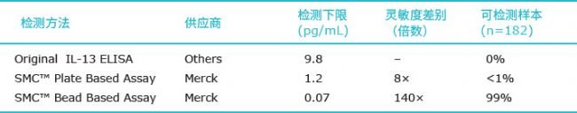 SMC™单分子免疫检测平台具备数倍乃至上百倍于高质量ELISA检测试剂盒的灵敏度,磁珠孵育系统达到了0.07pg/mL的超高检测灵敏度,实现了所有个体本底表达水平的检测,从而得到了血液中IL-13在治疗条件下的完整变化数据,提供了关键的临床证据。