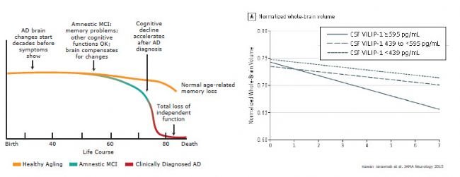 寻找合适的生物标志物用于早期诊断对于防治阿尔茨海默症十分关键。Aβ蛋白造成的淀粉样蛋白沉淀和tau蛋白造成神经纤维缠结,会在zei早出现认知损失症状的10-15年前开始,这段时间也被称为阿尔茨海默症潜伏期(preclinical-Alzheimer Disease)。如果能在这个时期尽早确认疾病的出现,将为医学干预和治疗争取非常宝贵的治疗期。因此,要求有更好的生物标志物能够在早期进行诊断。通过SMC™单分子免疫检测平台,研究者自主开发出了VILIP(Visinin-like protein-1)的超高灵敏度检测技术,并且证实VILIP在阿尔茨海默症造成的神经细胞损失方面是非常有效的生物标志物。