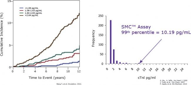 在一项长达12年的连续研究中,cTnl的价值被彻底地重新定义。研究者在12年前检测了正常个体的cTnl, 并且根据本底表达水平的差异将被测者分为4组。在随后12年的临床追踪中,发现本底表达cTnl较高的个体倾向于较高的累积心脏病发病率,而本底表达丰度低于1.06pg/mL的个体12年后心脏病的累积发病率极低。研究揭示cTnl本底表达水平可影响多年后心脏病事件发病率。