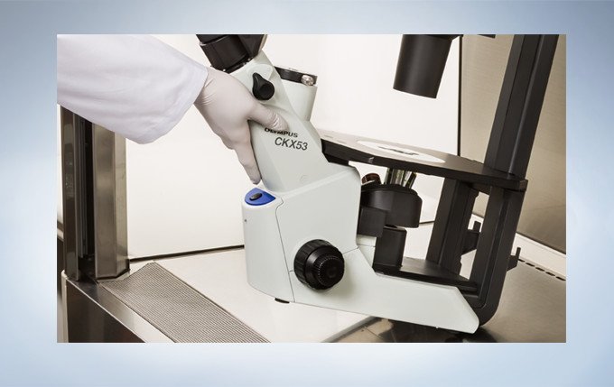 CKX53设计用于配合洁净工作台使用。 这款具有抗紫外线涂层的显微镜在紫外线灭菌过程中可留置在洁净工作台上。 与此前的CKX型号相比,CKX53重量大约轻了7公斤,且占地空间更小,因此占用的实验室空间极小。 该显微镜仅用一只手就可轻松搬运,搬运时握持观察镜筒的颈部。 显微镜底座上配有滑动垫板,方便显微镜的定位。