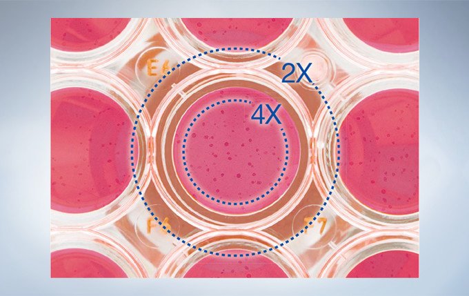 PLN2X物镜的环状光阑CKX3-SLPAS拥有22mm的视场,直径11mm。 由此,使用该物镜观察能够完美高效地筛选所感兴趣的细胞,获得更快的细胞培养过程。 该2X物镜与其他物镜相比具有明显更高的对比度,甚至能够让样本中的透明目标获得清晰识别。 例如,在观察96孔微孔板时,宽广的视野在无需移动载物台情况下即可观察一个孔内的所有细胞。