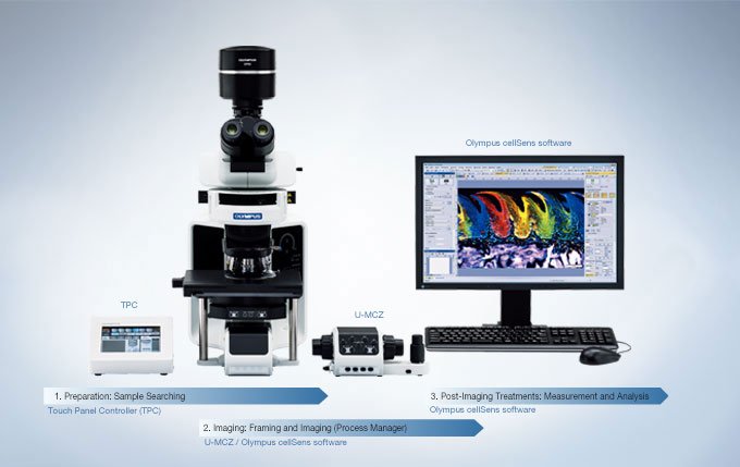 使用cellSens软件返馈通过触摸屏或U-MCZ控制器控制显微镜而采集到的所有数据,使用户能够以最便捷的方式自由操作显微镜。从图像捕捉到报告生成, cellSens软件根据每位研究人员的工作流个性化各自的操作环境。