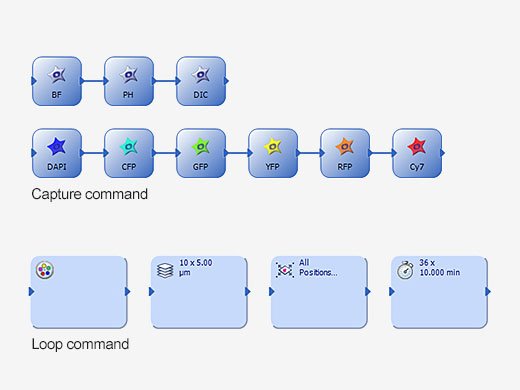在 cellSens Dimension 成像软件中,通过图形化试验管理系统 (GEM) 可以轻松设置试验,实现全自动多维度观察(X、Y、Z、T、波长和位置)。