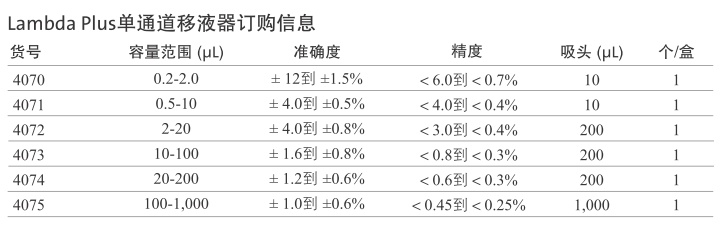 Lambda Plus移液器具有最高水平的精确度、可重复性和舒适性。Lambda Plus移液器有单通道、8通道和12通道三种,均可保持平稳的活塞运动且极为省力。可通过转动拇指转轮或活塞按钮来设定量程,锁定装置防止意外转动。