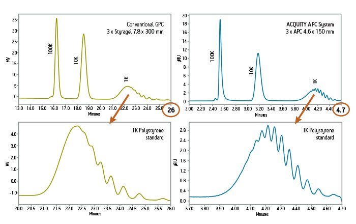 使用 ACQUITY APC 系统分析聚苯乙烯与传统 GPC 相比分离度更高、速度更快,(100K、10K、1K)。