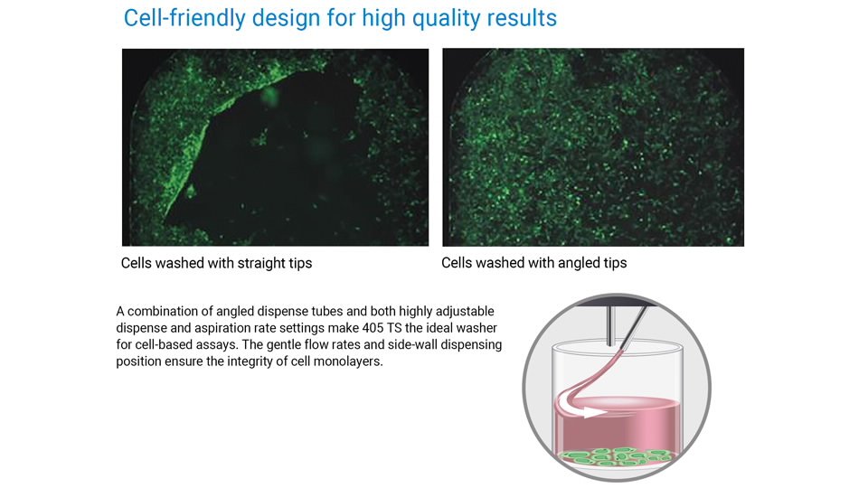 405 TS 配备倾斜式分液管,分液和吸液速率设置高度可调,是用于细胞分析的理想洗板机。其流速温和,分液位于侧壁,可确保细胞单层的完整性。